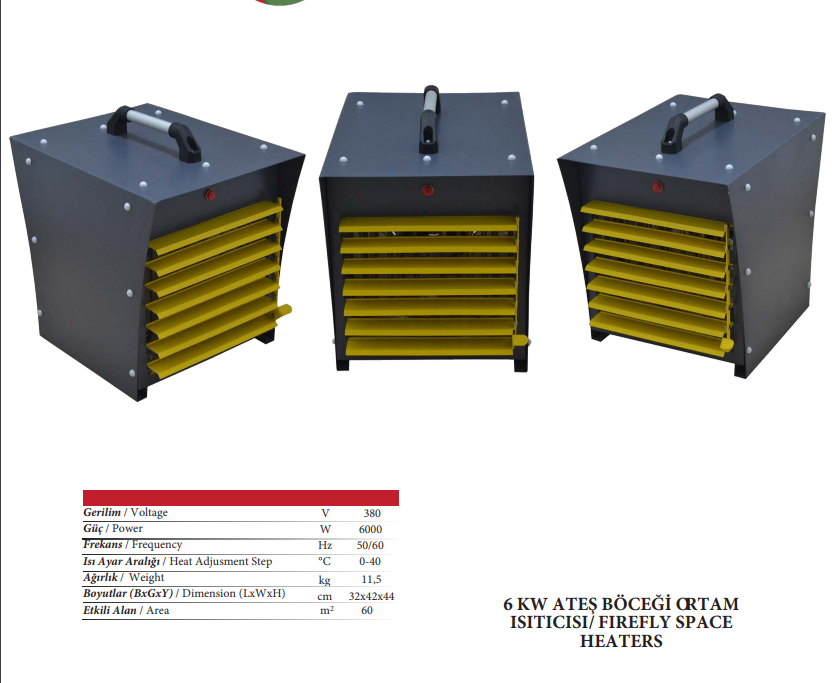 Farklı projelerde ihtiyaç halinde olan ortam ısıtıcıları çevre dostu yapıları ve işlevsel özellikleriyle dikkat çekmektedir. 6KW gücünde olan ortam ısıtıcı modeli aynı zamanda enerji tasarruflu olarak kullanabileceğiniz ısıtıcı modelleri arasındadır. Enerji maliyetinizi optimum seviyelere getirebileceğiniz 6KW ateş böceği ortam ısıtıcı modelini kolay bir şekilde istediğiniz yere sabitleyerek kullanabilirsiniz.